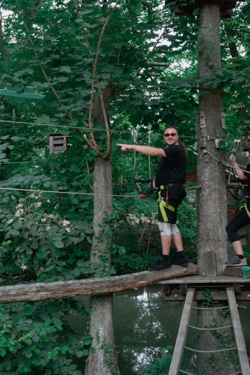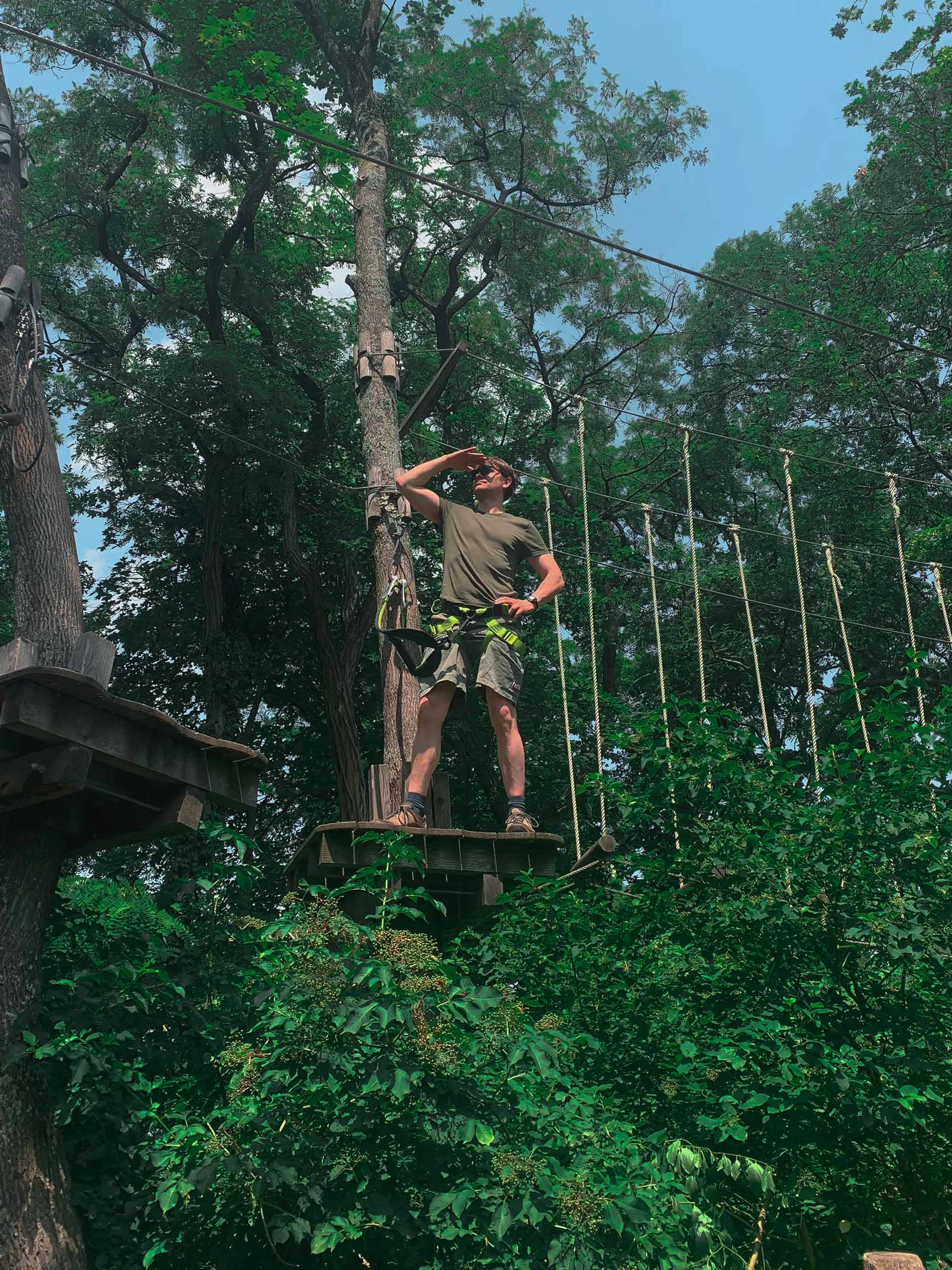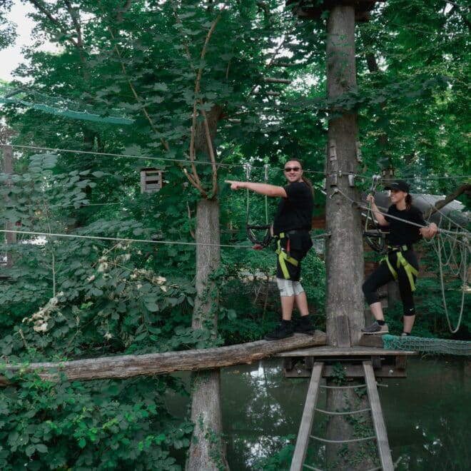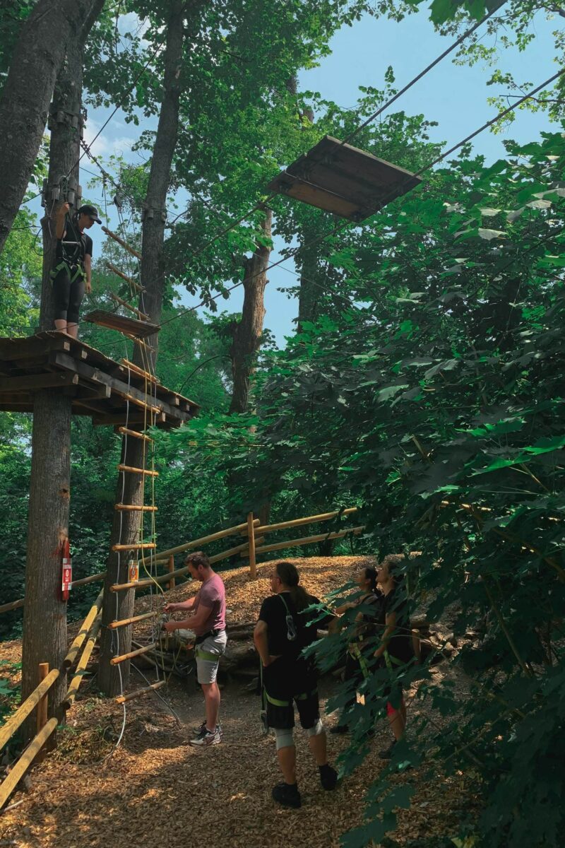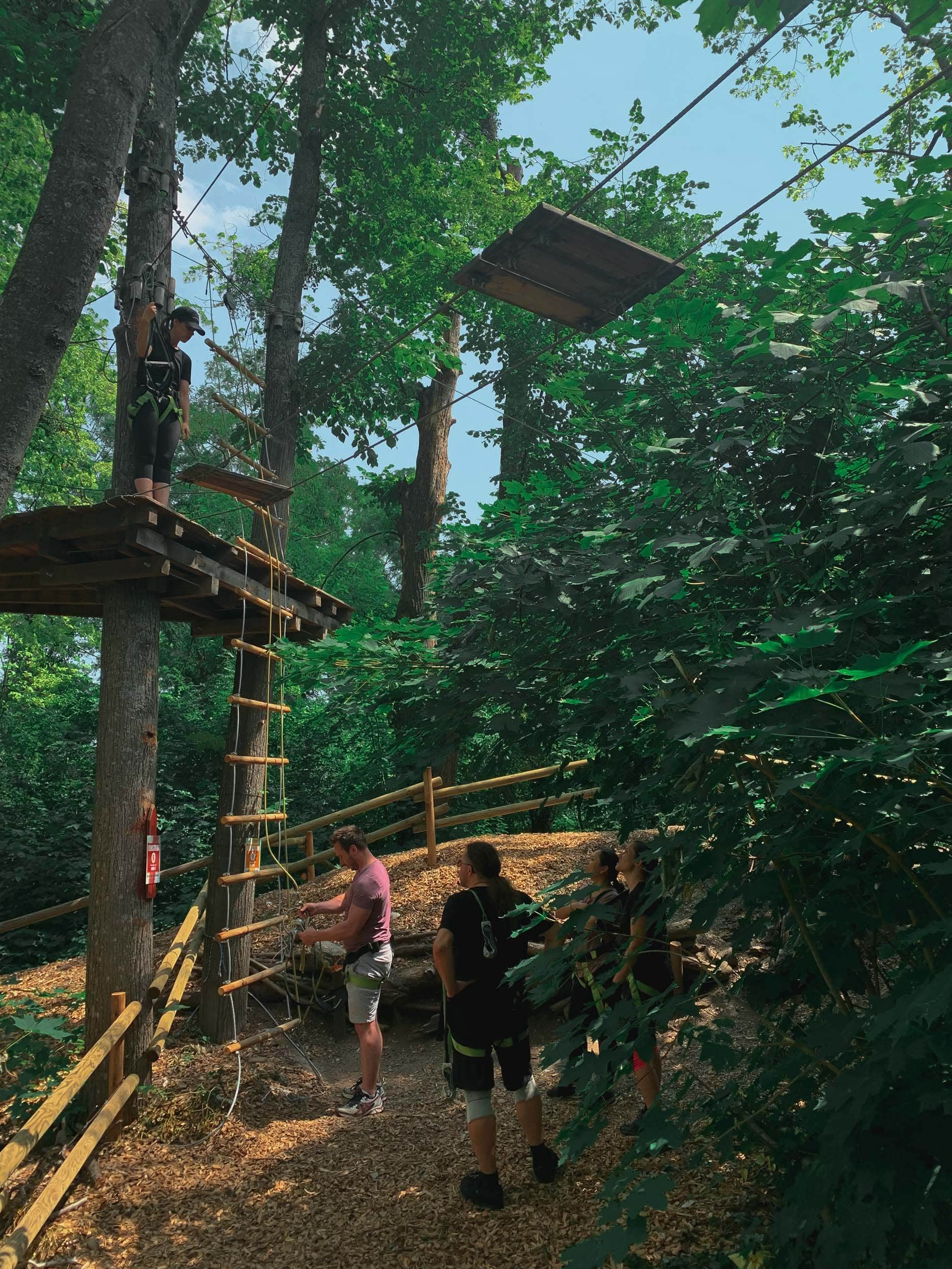 Gleich am ersten Tag wollten wir richtig hoch hinaus. Von Dinosauriern gejagt und von Seilen gefesselt, kämpften wir uns mit viel Teamgeist durch den Dschungel des Kletterparks Tattendorf. Dank Nataschas wegweisenden Worten „Das Ziel ist das Ziel!“ und Alex‘ inspirierendem Zuspruch „Stell dir vor, du wärst ein Affe!“ haben wir drei von vier Parcours in der vermeintlichen Rekordgeschwindigkeit von über drei Stunden gemeistert. Unsere Kärntner Kletterkanone Reiner sagte dann sogar dem vierten Parcour den Kampf an – der Rest des Teams kümmerte sich in der Zwischenzeit schon um Bier, Rosé Spritzer und Pizza.