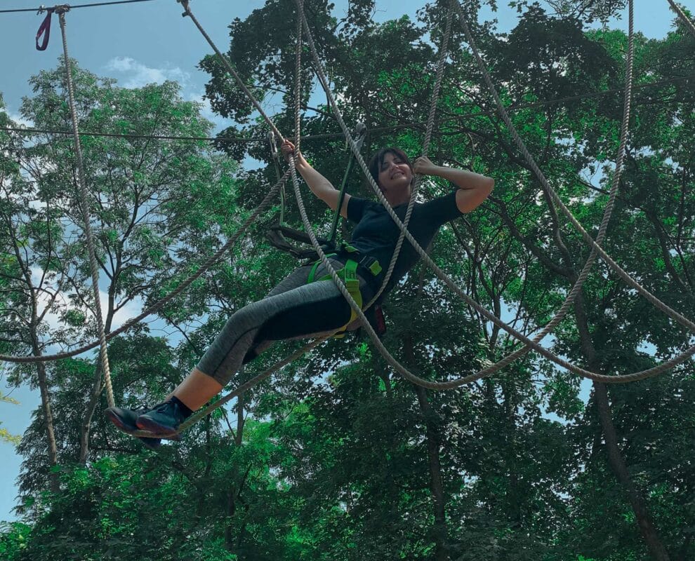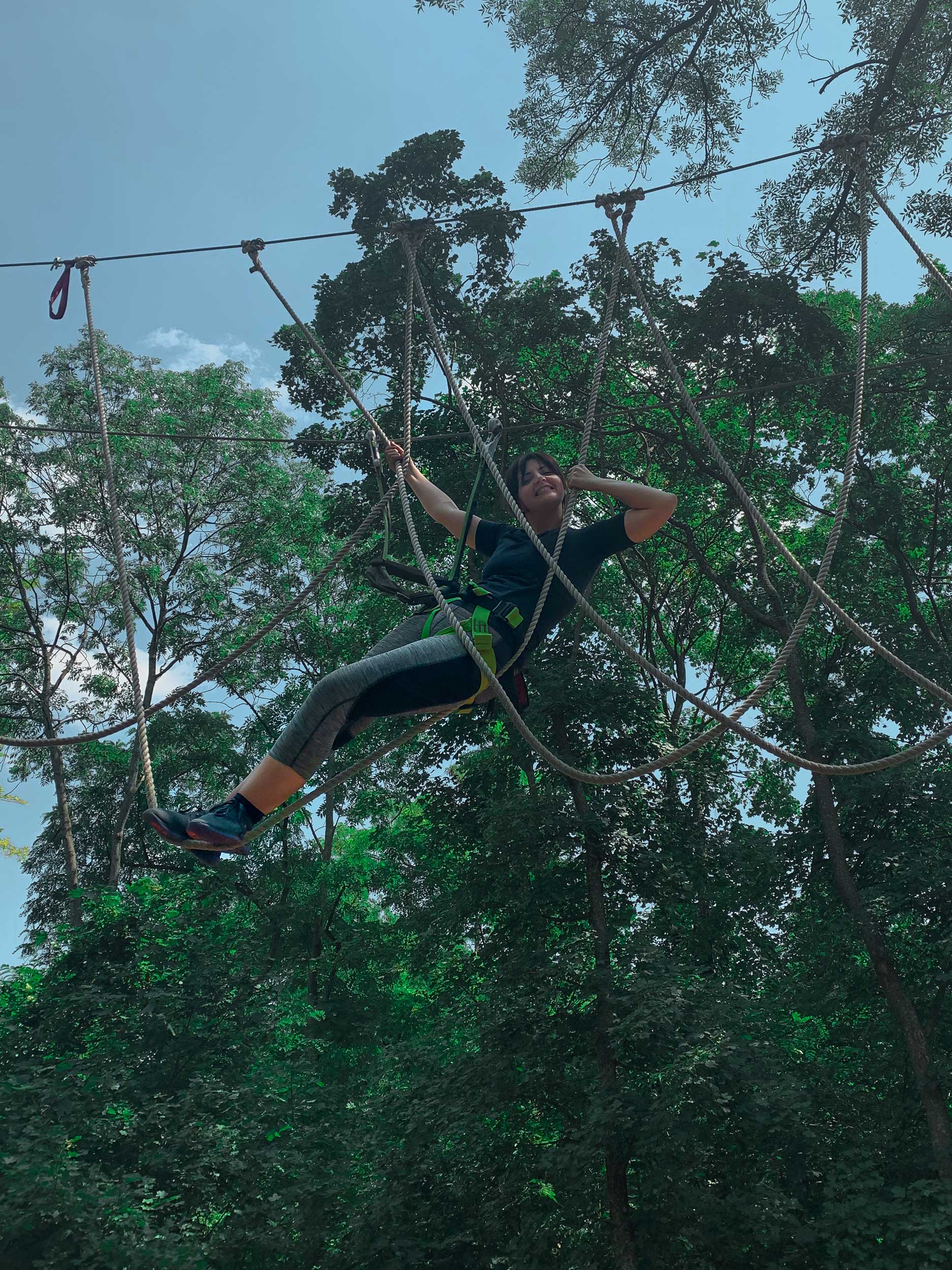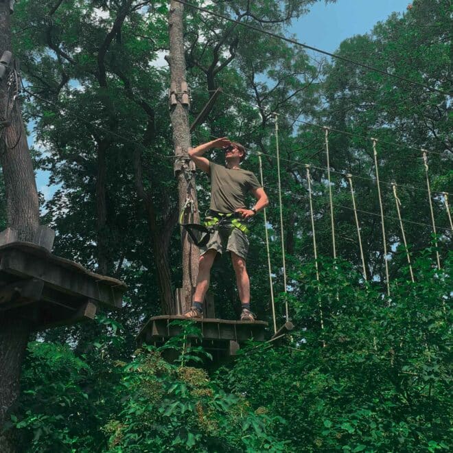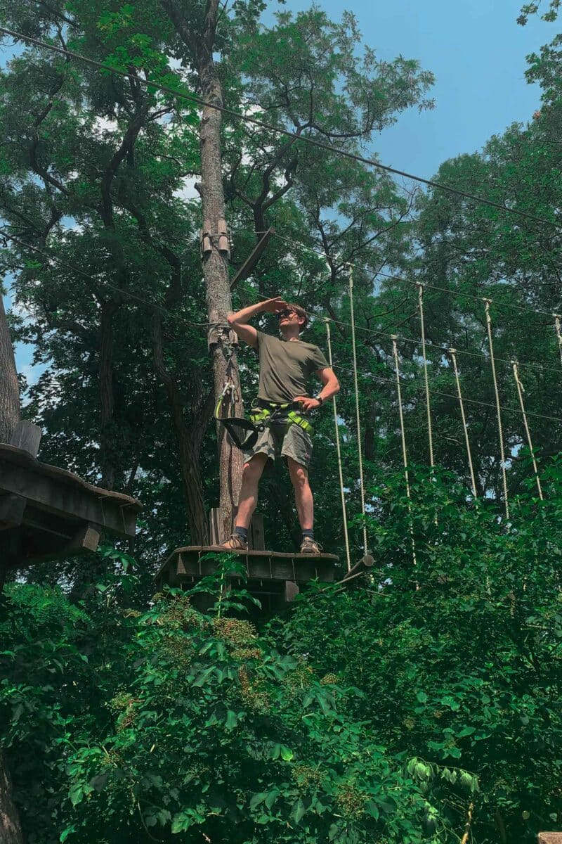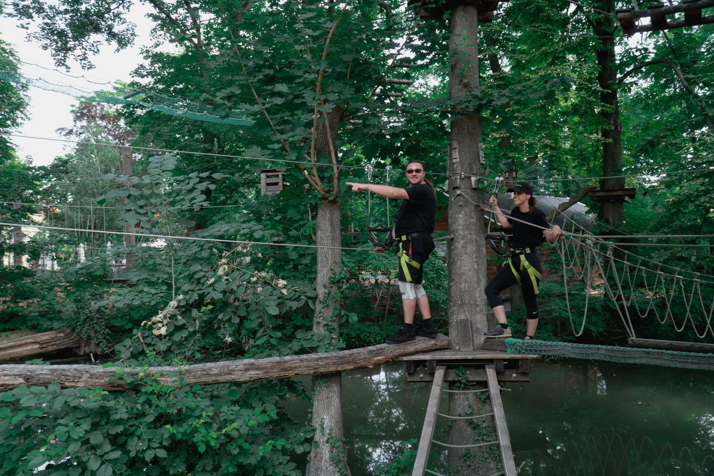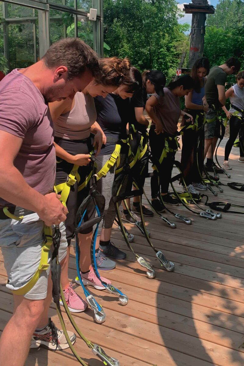 Gleich am ersten Tag wollten wir richtig hoch hinaus. Von Dinosauriern gejagt und von Seilen gefesselt, kämpften wir uns mit viel Teamgeist durch den Dschungel des Kletterparks Tattendorf. Dank Nataschas wegweisenden Worten „Das Ziel ist das Ziel!“ und Alex‘ inspirierendem Zuspruch „Stell dir vor, du wärst ein Affe!“ haben wir drei von vier Parcours in der vermeintlichen Rekordgeschwindigkeit von über drei Stunden gemeistert. Unsere Kärntner Kletterkanone Reiner sagte dann sogar dem vierten Parcour den Kampf an – der Rest des Teams kümmerte sich in der Zwischenzeit schon um Bier, Rosé Spritzer und Pizza.